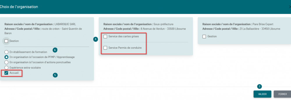 • Les organisations réelles ont été saisies dans “Mes organisations professionnelles”. Il convient d'en sélectionner une en cliquant sur