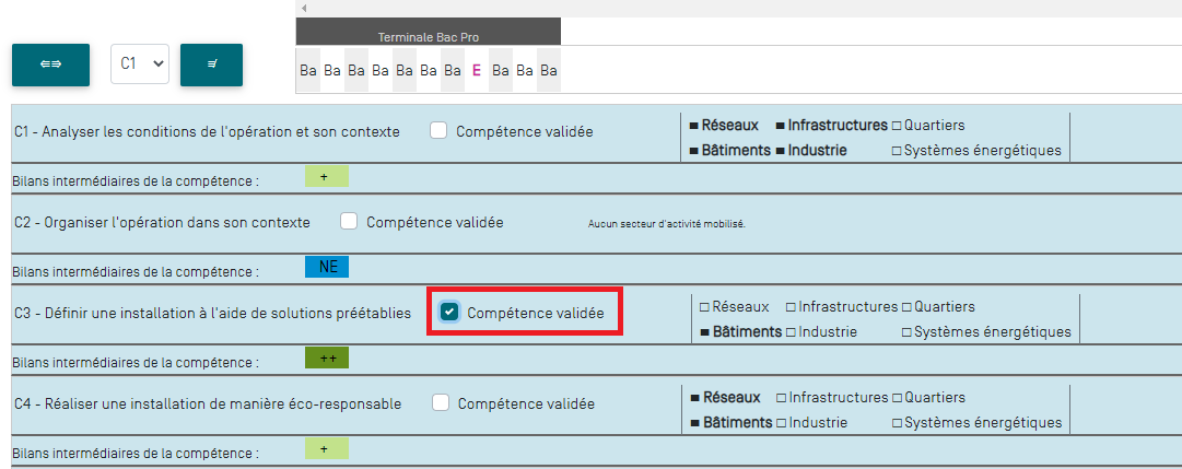 Choisissez les compétences qui sont validées en fonction des résultats de l'apprenant en cliquant sur