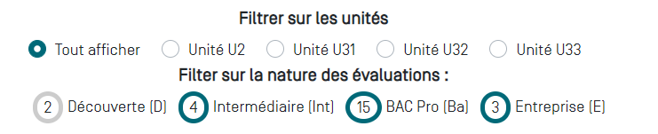 Vous avez la possibilité de filtrer les unités et la nature des évaluations à consulter.