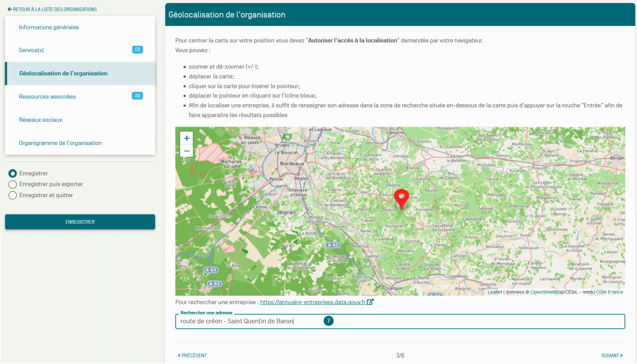 Vous renseignez l'adresse de l'organisation dans la barre de recherche pour la géolocaliser