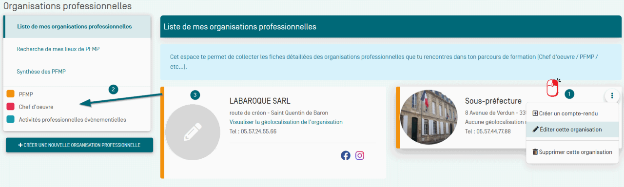 La liste de vos organisations s'affiche sous forme d'une vignette. La couleur fait référence à la nature de votre implication dans l'organisationPFMP, Chefd'oeuvreou Activités professionnelles