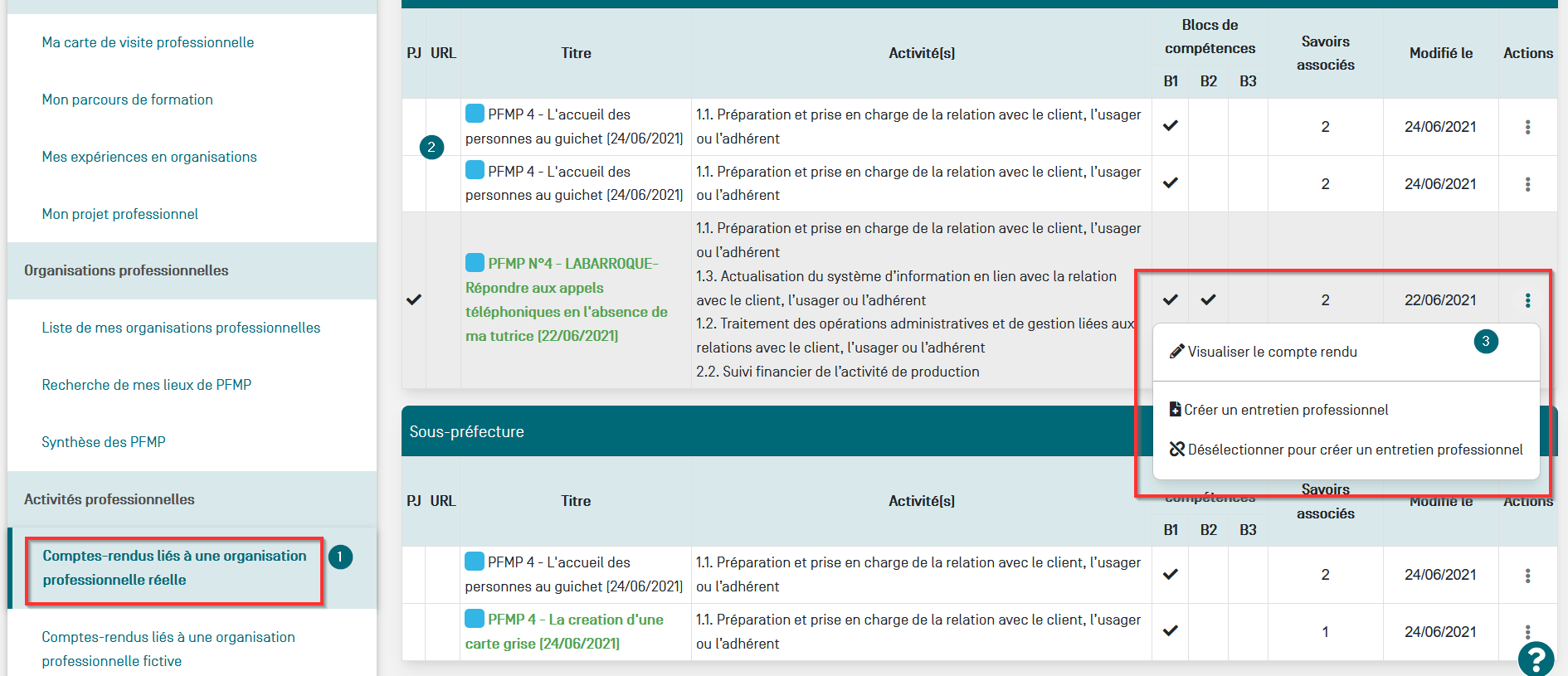 Vous visualisez l'ensemble des comptes-rendus de l'apprenant trié par organisation