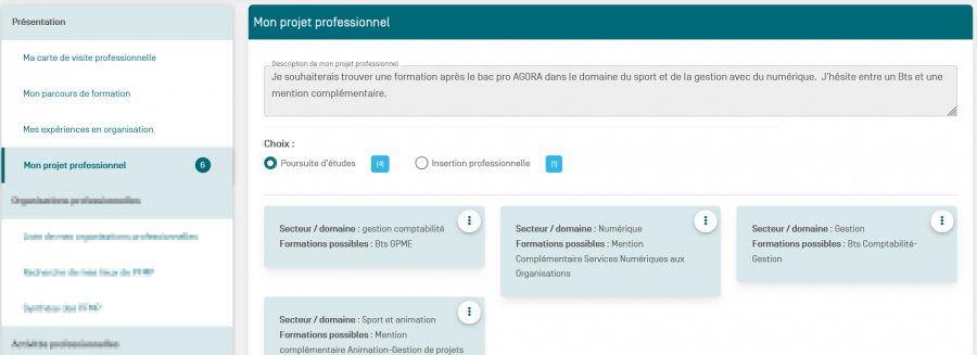 Le projet professionnel est une partie intéressante du portfolio. Elle permet de préparer progressivement l'apprenant au postbac que ce soit dans le cadre d'une insertion professionnelle ou d'une poursuite d'études ou les deux s'il est indécis.