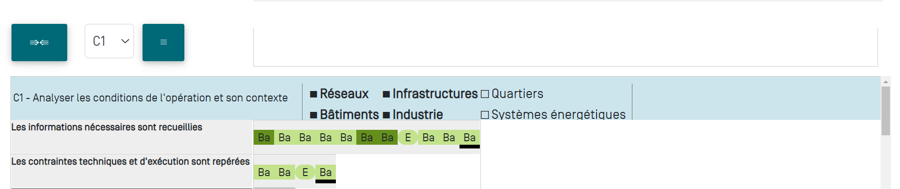 La création d’un bilan intermédiaire de compétences nécessite de positionner l'apprenant sur les compétences qui sont évaluées. Un affichage en mode condensé est possible pour faciliter la lecture et l’analyse.